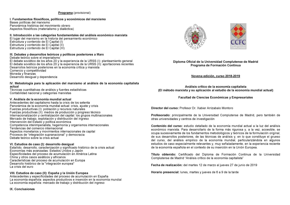 Xabier Arrizabalo M On Twitter Novena Edicion Del Diploma Oficial De La Complutense Analisis Critico Del Capitalismo Del 12 De Marzo Al 27 De Junio Clases Los Lunes Martes Y Jueves Posibilidad