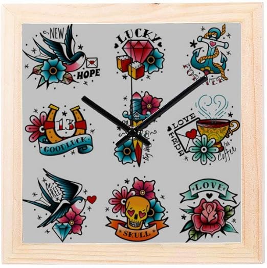 Amazon Com Country Decor Wall Clock Popular Traditional Tattoo Flash Non Ticking Square Silent Wooden Diamond Display Wall Clocks Painting Dial Kitchen Bedroom Decor Wall Clock Old School Home Kitchen