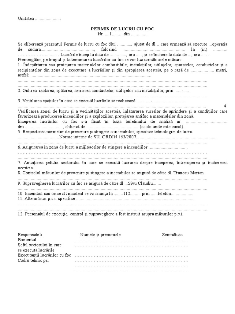 Permis De Lucru Cu Foc Model